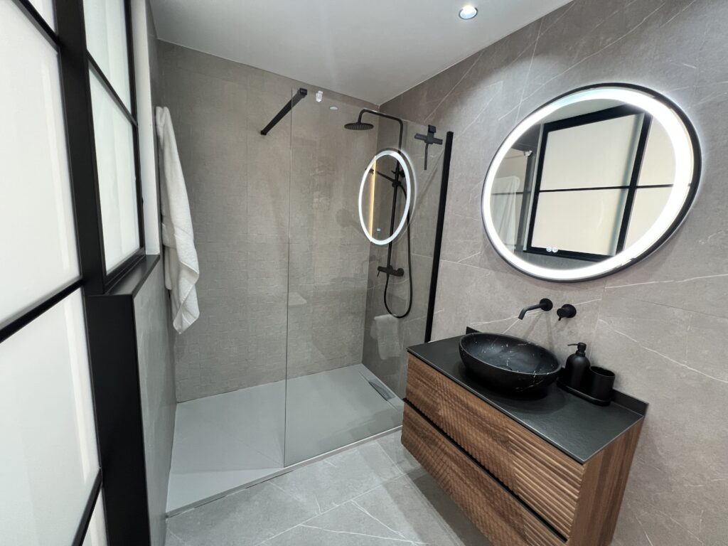El estilo industrial se inspira en fábricas y almacenes, combinando elementos rústicos con una estética urbana. Este diseño utiliza materiales como el metal, el hormigón y la madera reciclada. Los accesorios expuestos, tuberías a la vista y una paleta de colores neutros o grises crean un ambiente robusto y masculino. Elementos como espejos de gran tamaño y luminarias vintage aportan un toque auténtico y original.