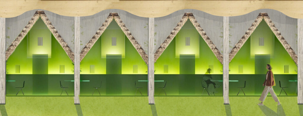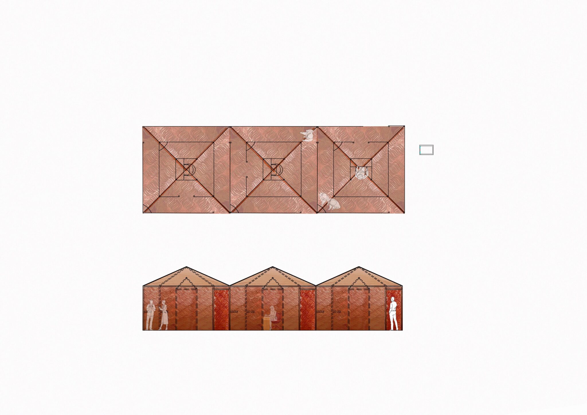 Módulos de concentración individual con espacios de apropiación que fomentan la serendipia. Inspirados en la obra de Carla Arcaddi "Triple tienda de campaña"
