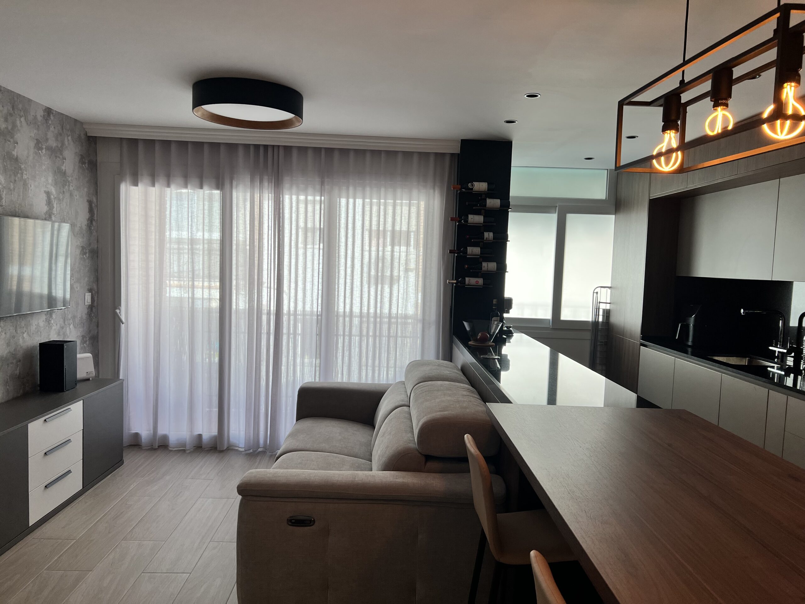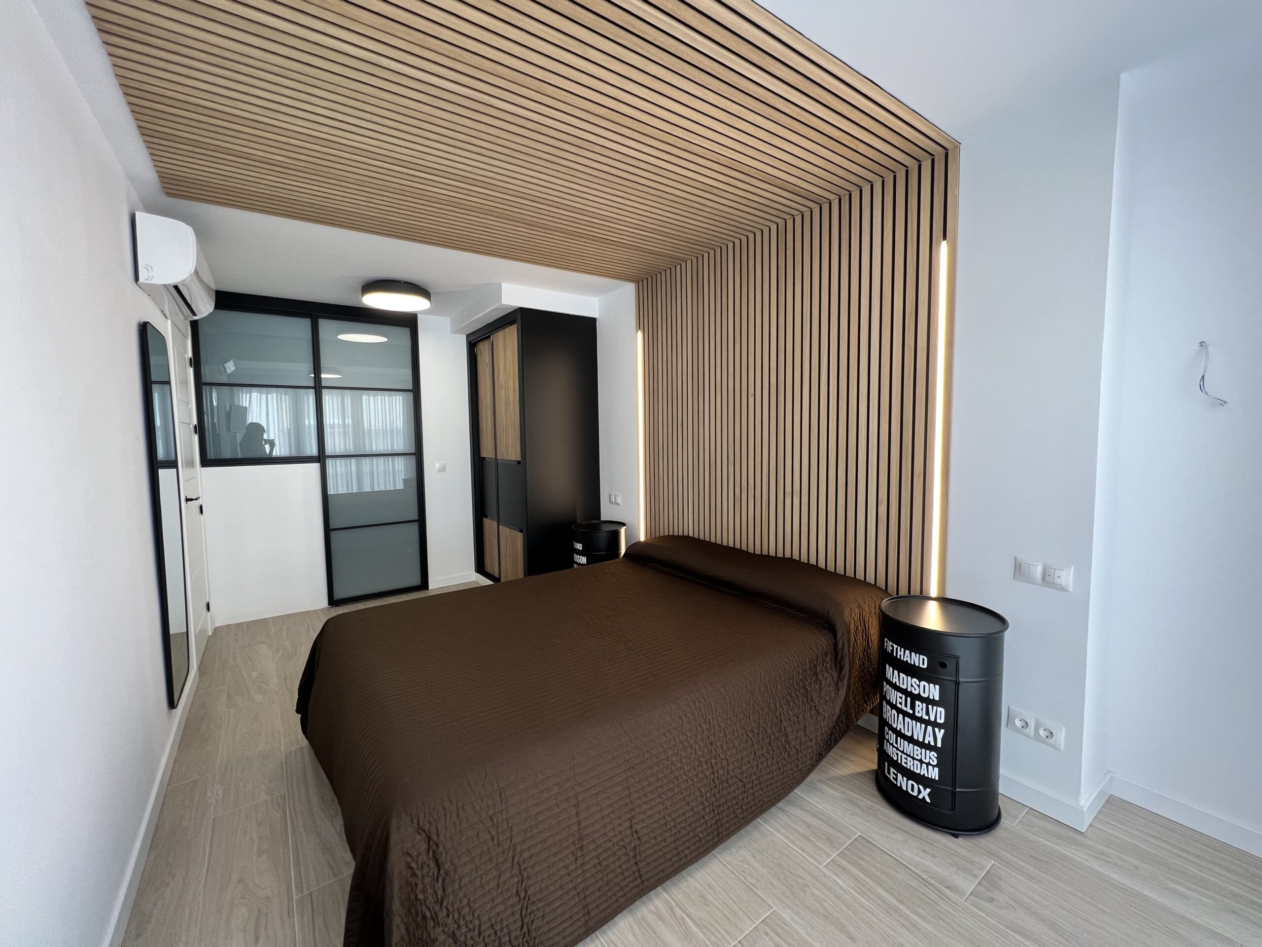 Transformación integral de un piso antiguo en un espacio moderno y vibrante, diseñado específicamente para un joven propietario que quería arriesgarse con elementos decorativos únicos. Uno de los elementos más destacados es la celosía, que actúa como separador de ambientes, creando una sensación de fluidez y conexión entre áreas. El papel imitación a cemento aporta una textura urbana y moderna que contrasta con la calidez de la madera en la cocina abierta con isla. El cabecero de la cama con palillería extendida al techo, se convierte en un punto focal que añade altura, continuidad y calidez al dormitorio.